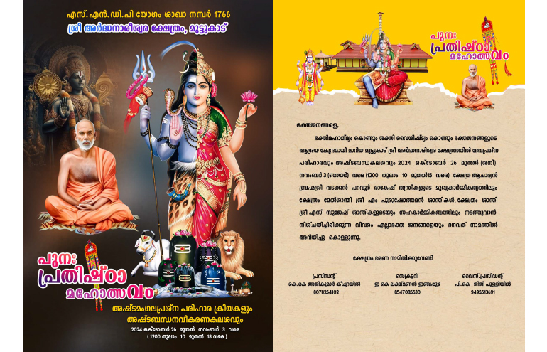 Muttukad Sree Ardhanareeswara temple is one of the famous Ardhanareeswara temple in Kerala. Muttukad is situated 20km away from Munnar in Idukki district, Kerala. Here the family of lord Shiva worshiped just as Kailasam. Also gives equal importance to Lord Vishnu. Shiva-Shakthi-Vaishnava showers blessings over their devotees.